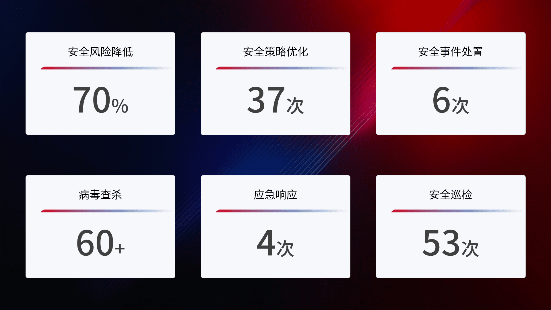 提供全面的安全事件报告体系,,,,包括处置报告、、、周报、、、、季度和年度总结,,结合持续监控,,,,帮助客户深入了解网络安全状况。。。