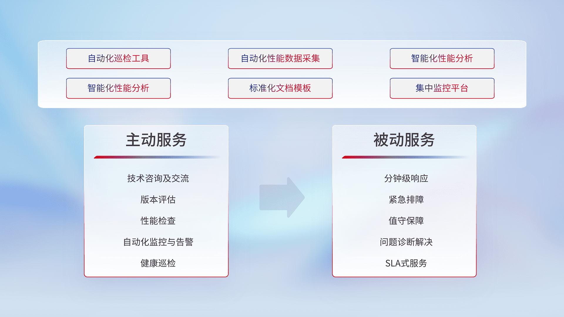 智能化工具和标准化文档,,,保障服务质量,,提供主动服务(包含技术咨询、、、版本评估、、性能检查、、、、自动化监控与告警、、健康巡检)和被动服务包含(分钟级响应、、、紧急排障、、、值守保障、、问题诊断解决、、、、SLA服务)。。
